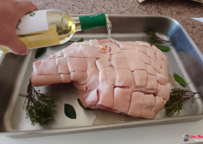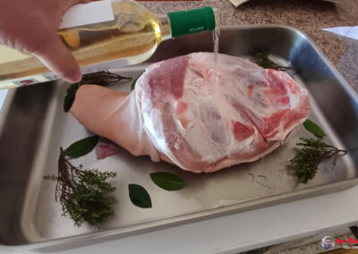- Rocía el lacón con vino blanco y frótalo con las manos, asegurándote de que el vino penetre bien en todos los cortes.