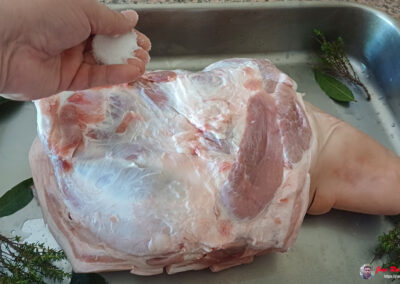 - Espolvorea un puñado de sal sobre el lacón y distribúyela uniformemente, frotando con las manos para cubrir todos los lados.