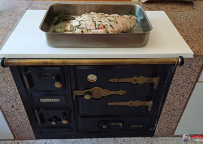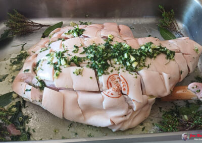 El Lacón Asado al Horno es una receta tradicional que se prepara con lacón marinado desde el día anterior con una mezcla de ajo, perejil, laurel, tomillo, sal, aceite de oliva y un toque de Tabasco. Se hornea lentamente durante cuatro horas, manteniendo la humedad con vino blanco y agua. Finalmente, se gratina para obtener una piel crujiente y se sirve acompañado de una salsa espesa, preparada con los jugos de la cocción.