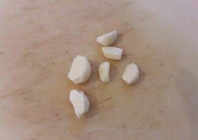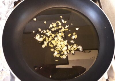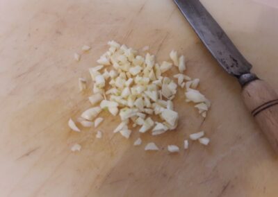 - Picamos el ajo en trozos muy pequeños y los añadimos.