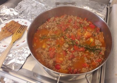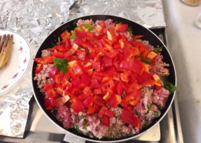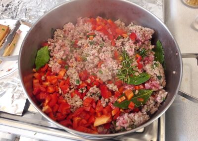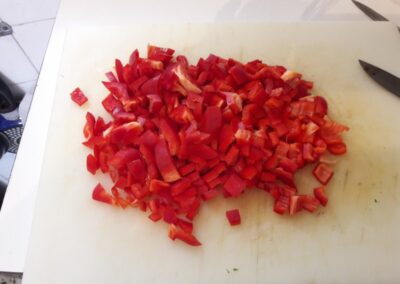 - Picamos los pimientos morrones, en trozos muy pequeños y también los agregamos y volvemos a remover, si es necesario echamos un vaso de agua, que cubra el fondo, lo importante es que la mezcla no quede seca.