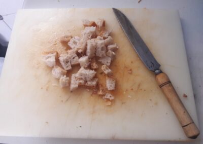 14. ahora echamos el pan, en trozos pequeños y cuando este ablande se puede machacar con un tenedor. En lugar de pan podemos echar unas cucharadas de harina.