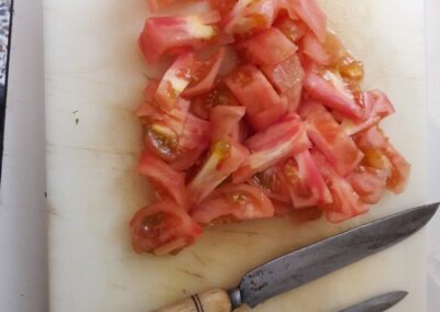 - Picamos el tomate, también en trozos pequeños y lo echamos a la cazuela.