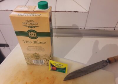 - A media cocción de la Carne y demás ingredientes se le hecha el azafrán diluido en un vaso de vino blanco.