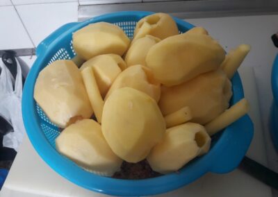 16. El siguiente paso es echar los trozos que hemos extraído al vaciar el interior de las patatas, los cuales teníamos cubiertos con agua. Echamos todo, pedazos de patata y agua.