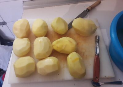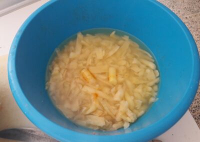- Mientras la Carne del relleno se va haciendo vamos vaciando las patatas con un utensilio adaptado para ello, si no lo tenemos, podemos utilizar una cuchara pequeña. En este paso tenemos que tener en cuenta dos detalles, el primero e que la patata que extraemos del vaciado la echamos en un recipiente con una poca de agua para que no se oxide y además, soltará la fécula que contiene, la utilizaremos más tarde. El segundo detalle será conseguir, al vaciar las patatas, unos trozos grandes para luego de rellenar las patatas tapar el agujero.