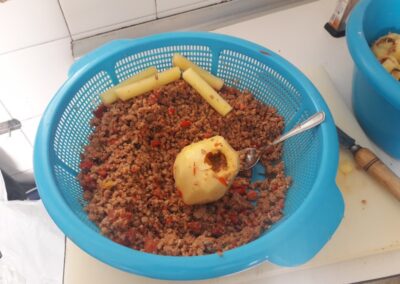 - Una vez cocinada la carne, y demás ingredientes, la escurrimos bien con un escurridor y la reservamos para rellenar las patatas.