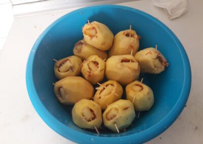 18. Mientras se va cocinando y diluyendo la salsa, rellenamos las patatas y las tapamos con el trozo de patata que habíamos reservado, para que no se suelte pinchamos el trozo de patata y la pared de la patata rellena con un palillo.