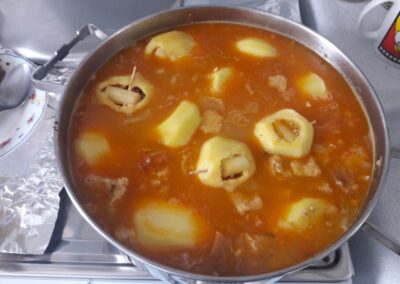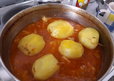 19. Cuando terminemos de rellenar las patatas, las echamos a la salsa, rellenamos de agua hasta cubrirlas y las dejamos cocer a fuego lento con la pota destapada para que se vaya evaporando algo de agua y se densifique la salsa. En este punto es muy importante controlar que no nos pasemos de cocción y que se deshagan las patatas. Es mejor apagar el fuego un poco antes y dejar que se acaben de cocer con el calor residual.