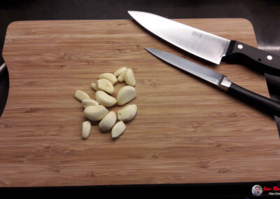 - Pelamos los dientes de ajo, los cortamos en tres trozos y los echamos al mortero.