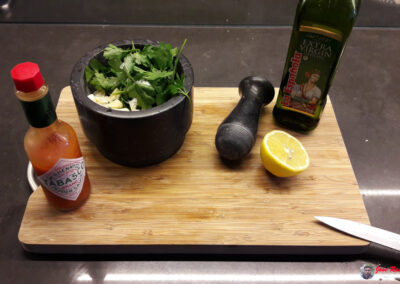 - Una vez machacados el ajo y el perejil, añadimos unas gotas de tabasco.