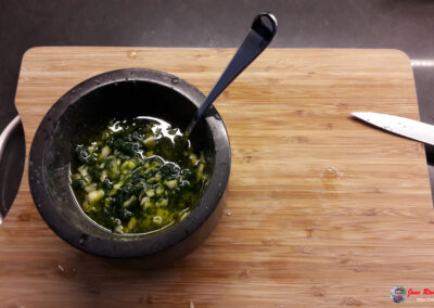 - Machacamos todos los ingredientes en el mortero hasta obtener una pasta homogénea.