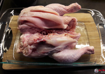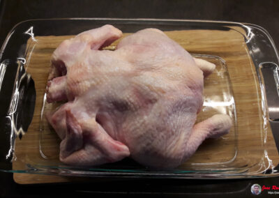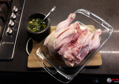 - Colocamos el pollo con la piel hacia abajo en la bandeja.