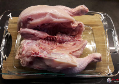 - Lo abrimos de arriba a abajo por el vientre y, con las manos sobre las pechugas, presionamos hasta romper las costillas para que quede totalmente extendido.