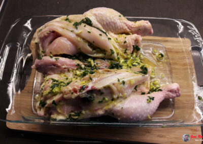 - Le damos la vuelta al pollo, dejando la piel hacia arriba, y lo extendemos procurando que quede expuesta la mayor parte de la piel.