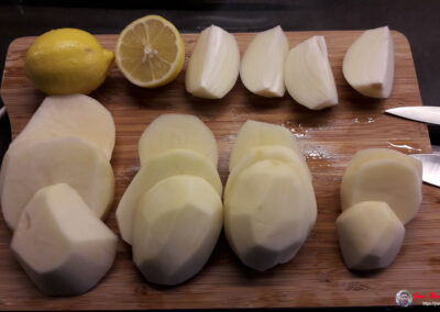 - Pelamos las patatas y las cortamos a la mitad en sentido longitudinal.