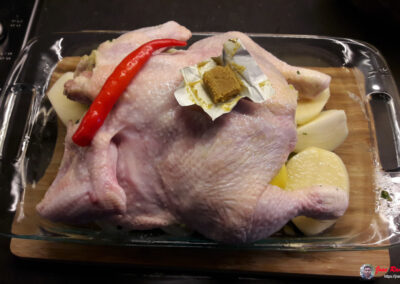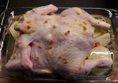- Introducimos el pollo en el horno y lo cocinamos a 170 grados durante aproximadamente una hora y media. Es importante vigilar el proceso, ya que el tiempo de cocción puede variar según el horno.