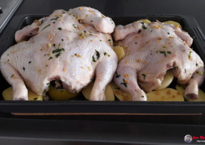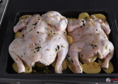 El toque cítrico del limón, combinado con el toque picante del tabasco y la guindilla, realza el sabor del pollo, mientras que el aceite de oliva virgen le aporta una textura jugosa y una capa de antioxidantes saludables. Las patatas asadas se impregnan del jugo del pollo y el caldo concentrado, creando una guarnición perfecta que complementa cada bocado.