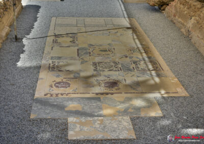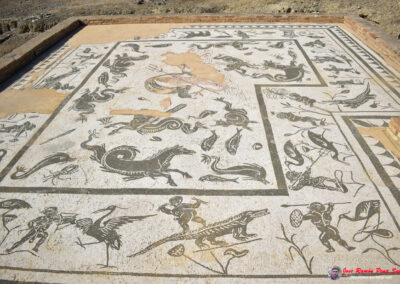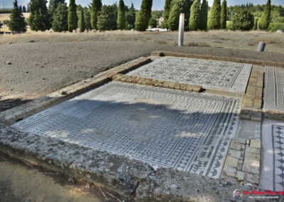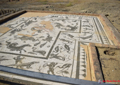 Más allá del anfiteatro, las calles porticadas de la ciudad están flanqueadas por los restos de lujosas villas, algunas aún decoradas con mosaicos vibrantes que cuentan historias de mitos y deidades. Estas residencias destacan por su sofisticación y son un testimonio del alto nivel de vida que disfrutaban algunos de sus habitantes. Ejemplo de ello es la Casa de los Pájaros, la casa del planetario, el edificio de Exedra, el edificio de Neptuno, las termas, etc.
