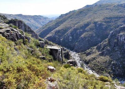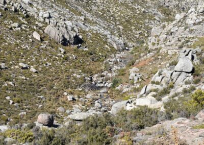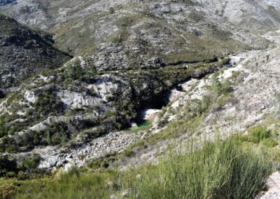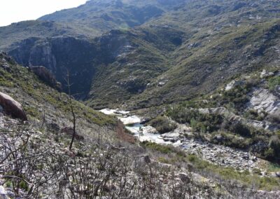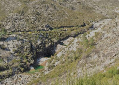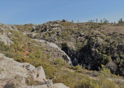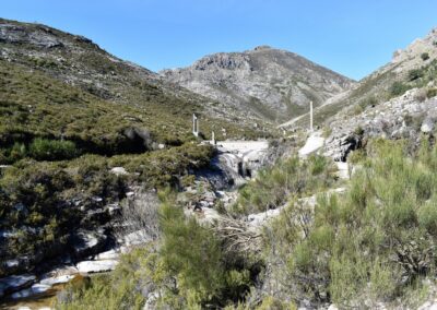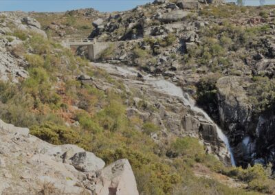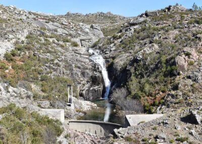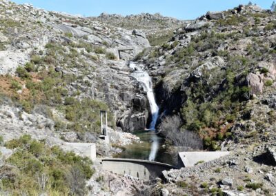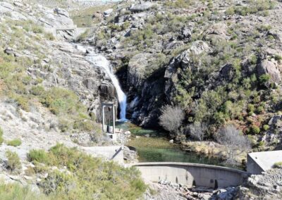 Antes de llegar a las 7 lagunas cruzaremos un rio, por un puente, con aguas muy claras y una cascada de unos 20 metros de altura. En su base, hay una represa de hormigón donde captan el agua para conducirla a una central hidroeléctrica mediante un túnel.