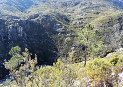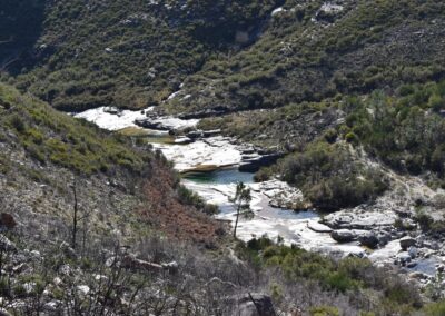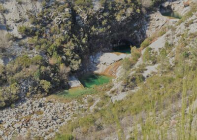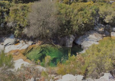 Llegamos a las 7 lagunas, desde la parte alta podemos verlas, una tras otra. Ellas son una serie pozos, de aguas muy claras, que forman unos escalones, en el mismo rio, caída tras caída, a lo largo de unos 500 metros. El desnivel entre laguna y laguna puede ser de unos 4 metros de media.